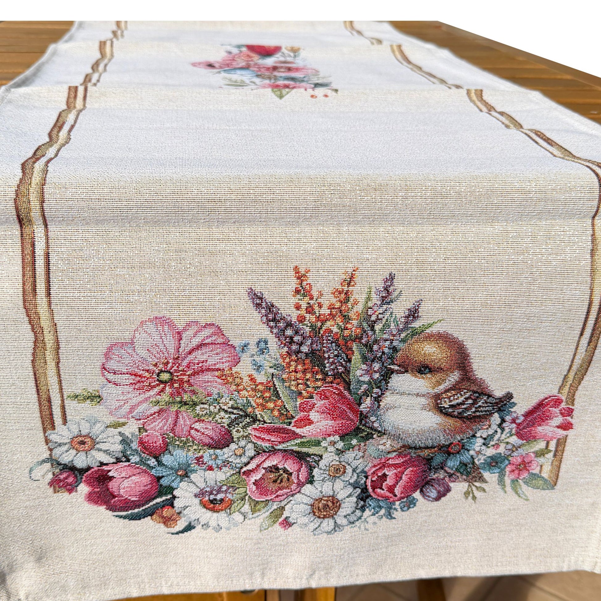 Un tocco primaverile alla tua tavola con questo runner in gobelin, decorato con l'illustrazione di un passerotto circondato dai fiori.